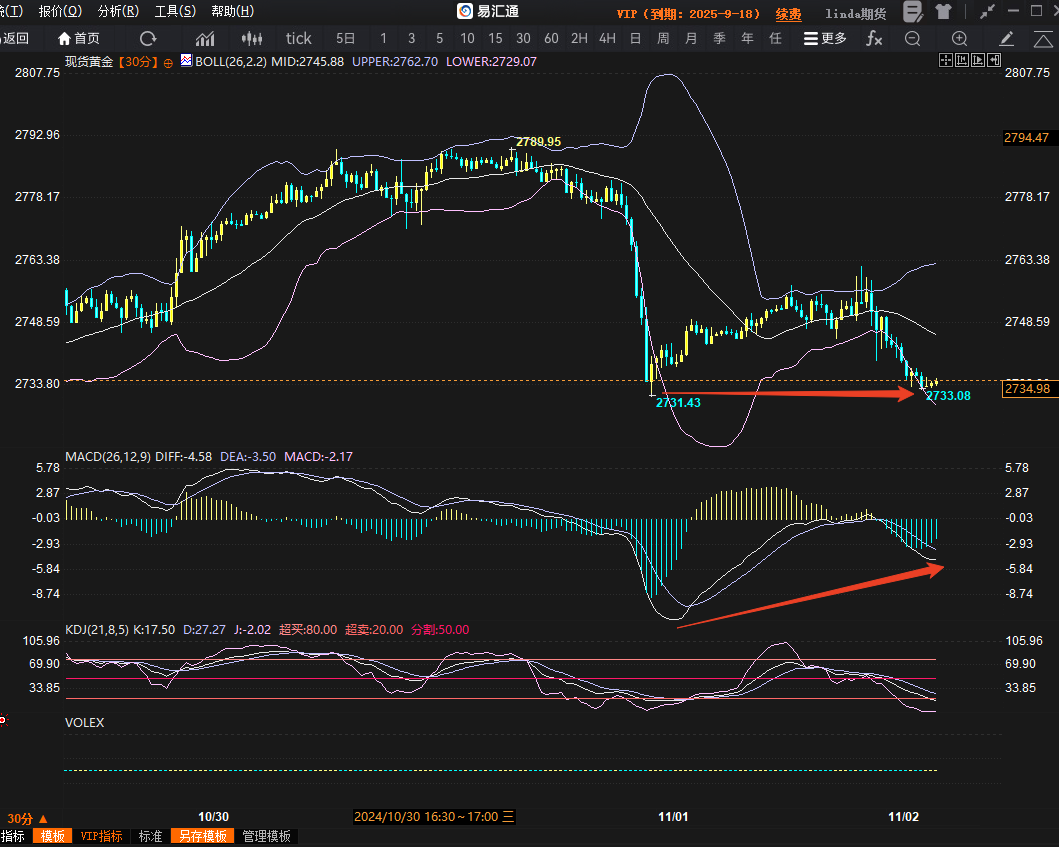 如果从4小时图看,金价在(11月1日)非农后所创高点2762刚好是受到了布林带中轨的有效压制,其受阻之后是一根大阴线和一根超级小的星线,表明市场暂时形成多空平衡。如果看近期10月23日22点至24日5点的两根K线,与最新这个会有似曾相识的感觉,这种小星线有可能成为转折为反弹的启动信号。两者的差别在于,24日那根是孕线,1日的那根不是。