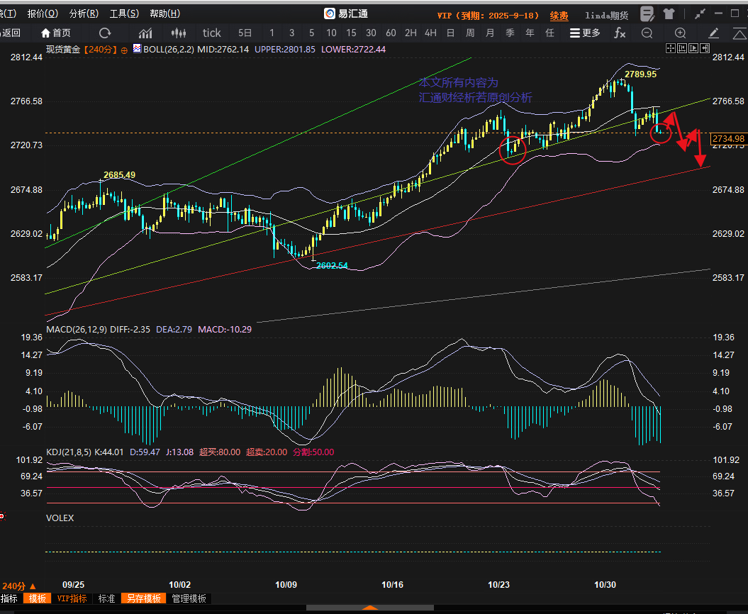 复盘一下,在1028周一开盘前本人发布的金价推析图文章中,这几点预测大体与实际行情走势相符:1)日图橙色粗体及橙色实体细线,对价格分别形成了有效阻力和支撑。2)本人当时文章预测金价大概率不会超过2782阻力位就会出现大跌行情,实际行情最高价虽在2789.95(≈2790),暴跌启动点却刚好在2782,这说明虽然多头短线对2782阻力有溢出效应,但最终还是受到了该价位的有效压制。 3)当时文章提醒,金价逼近空头兴趣点(逼近2750-2758的过程中容易受到卖盘打压),实际行情显示金价10月28日周一直接跳空低开超12美元于2735(这虽然被媒体解释为中东紧张局势降温,但这里有技术面的重要助推),并随后下探至2725一线。(不过,金价没有出现2708或2685的金坑,没有预期的疲软。)