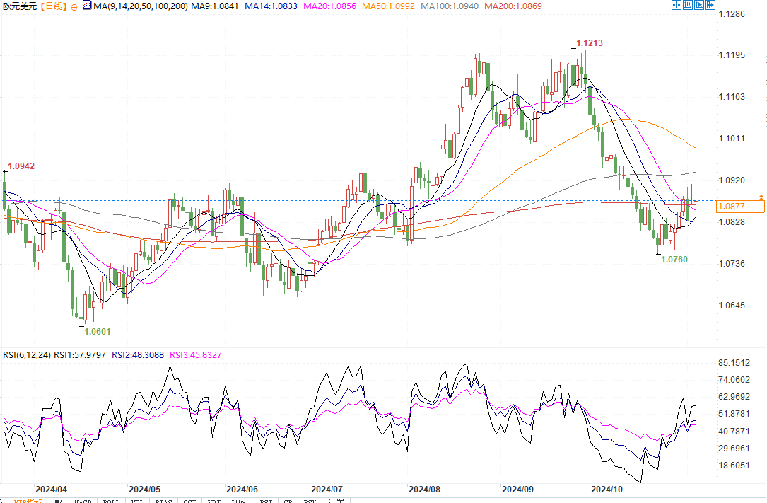 欧元兑美元小幅上涨。上周末发布的多项民调更倾向于哈里斯胜选,其中一项甚至暗示她在艾奥瓦州可能夺得意外胜利。