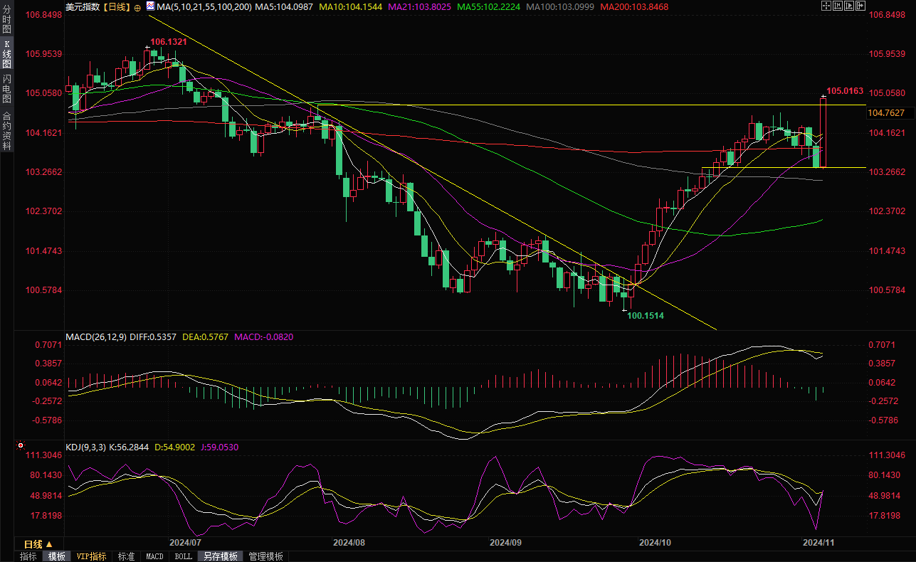 美元指数周三(11月6日)全线劲升,一度创7月10日以来新高至105.02,涨幅约1.55%,有望录得2022年9月以来最大单日涨幅,随着美国总统大选的初步结果逐步揭晓,投资者重返 "特朗普交易"。