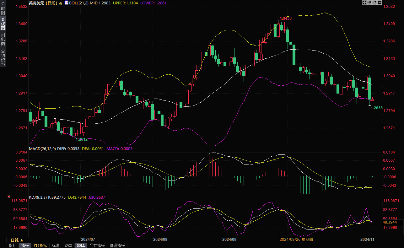 技术面来看,英镑兑美元日线动能指标信号负面,21 日布林带区间走软,5、10 和 21 日移动均线下滑,信号显示小幅偏空。初步支撑位为周三低点 1.2835 低点和 8 月低点 1.2665。