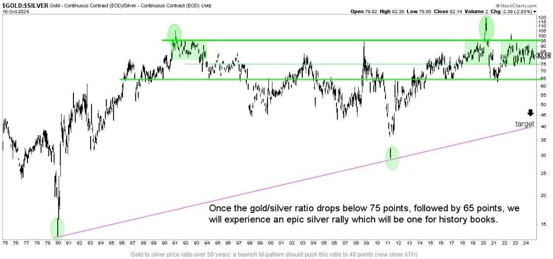 InvestingHaven的分析师更加看好白银。他们给出了“2025年50美元”和“2028 年之前77美元”的看涨价格目标,并补充了“到2030年白银峰值预测将达到82美元以上”。关于最近金银比率的变化有利于黄金,他们指出,“历史证据表明,金银比率进入80至100倍范围可能是白银价格大幅上涨的信号。这一比率表明白银相对于黄金被严重低估。”