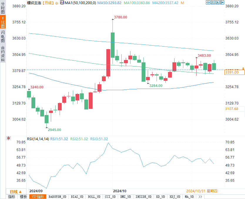 从技术面来看,螺纹钢在主要支撑位上方波动,呈现出良好的多头趋势。分析师认为,政策利好对价格形成支撑,但考虑到年底时节需求波动较大,关注后续政策落地的进展以及市场库存变动。