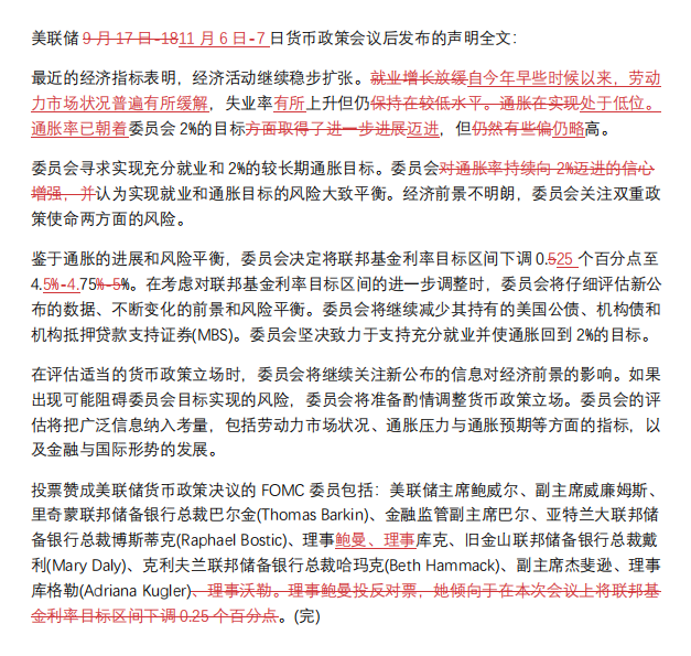 在为期两天的政策会议结束时,美联储将指标隔夜利率下调至4.50%-4.75%的区间,决策者注意到就业市场 "普遍放缓"。