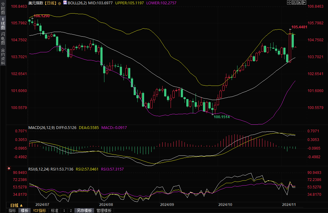 美元指数纽约尾盘下跌 0.67%,至 104.38。周三,由于投资者消化了特朗普的政策,美元指数触及四个月高点 105.45。