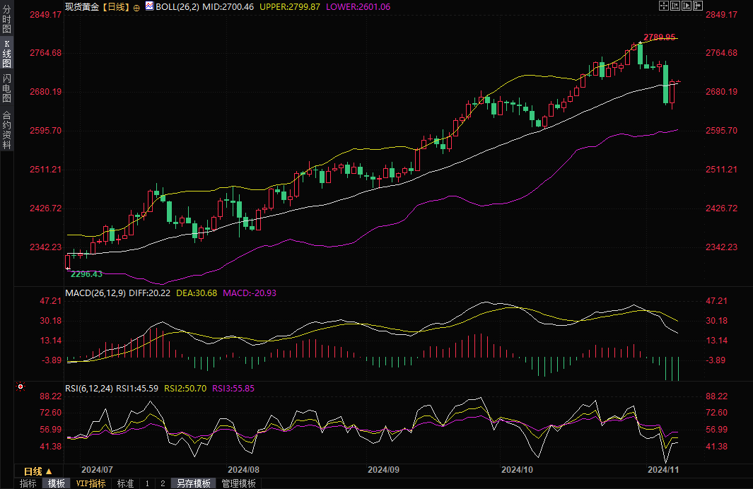 现货黄金窄幅震荡,目前交投于2704.76美元/盎司附近。金价周四上涨超过1%,盘中一度触及2710.10美元/盎司,收报2706.30美元/盎司,受助于美元和美债收益率回落,同时美联储如市场普遍预期的那样将利率下调25个基点。