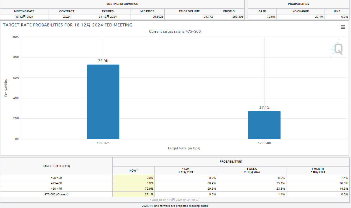 根据CME FedWatch Tool,交易员认为美联储在12月再次降息的几率为72.9%,高于周三的67%。