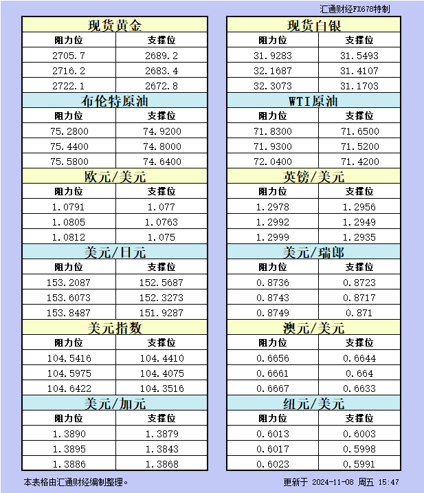 标题:11月8日欧市支撑阻力:金银原油+美元指数等八大货币对