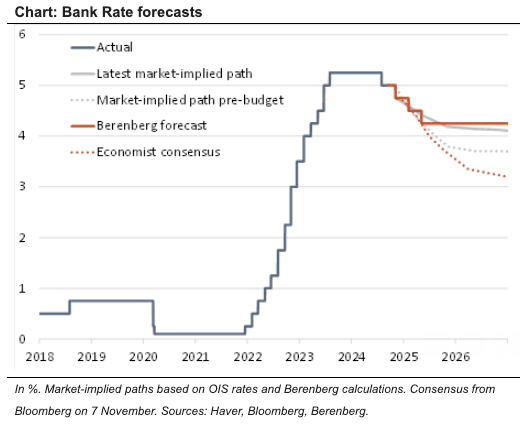 “在经济增长改善和通胀高于目标的背景下,我们预测英国央行在两次降息后将把银行利率维持在 4.25%。”