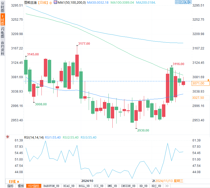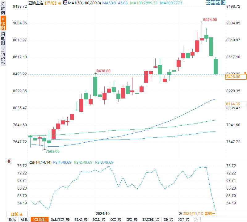 汇通财经APP讯——周三(11月13日)今日国内期货市场开盘波动显著,尤其在油脂、螺纹钢、纯碱等主力合约方面走势各异,反映出市场对于基本面变化和短期风险的多样反应。CBOT市场亦出现调整,其中大豆和豆油下跌幅度较明显,显示出供应压力逐渐增加的迹象。本文将对棕榈油、螺纹钢、纯碱、玻璃、豆粕、豆油、PTA和燃料油市场的最新行情与基本面动态进行分析。