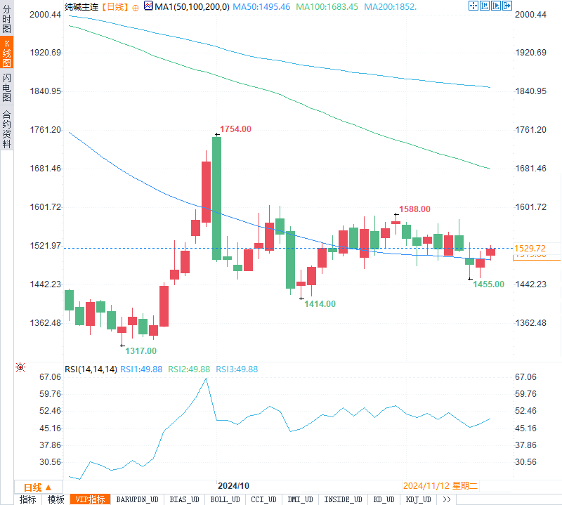 技术面来看,纯碱主力合约价格在1515元上下波动,有短期企稳迹象。分析人士建议关注后续玻璃需求的恢复情况,若需求端回暖对库存的消化有所帮助,纯碱价格可能会迎来一波上行空间。但需要留意的是,由于市场对玻璃需求复苏的预期并不一致,纯碱价格在短期内仍可能受到较大波动。