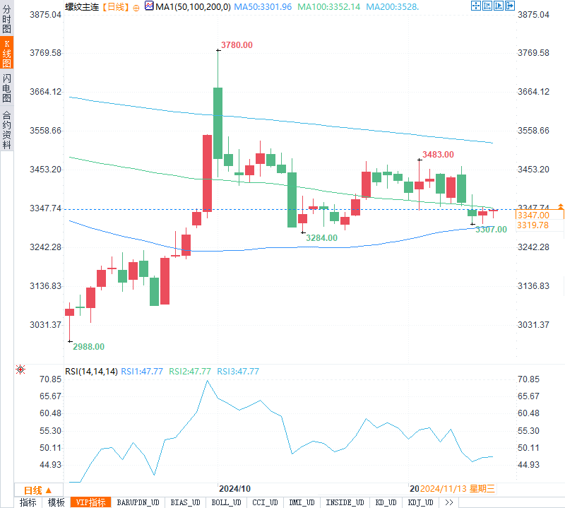 从技术面看,螺纹钢主力合约近期在低位徘徊,整体走势以区间震荡为主。分析师指出,螺纹钢价格的短期支撑位集中在3300元附近,若后续需求端没有明显提振,该支撑可能受到测试。因此,短期建议关注政策面消息的进一步指引,以判断螺纹钢价格的波动方向。