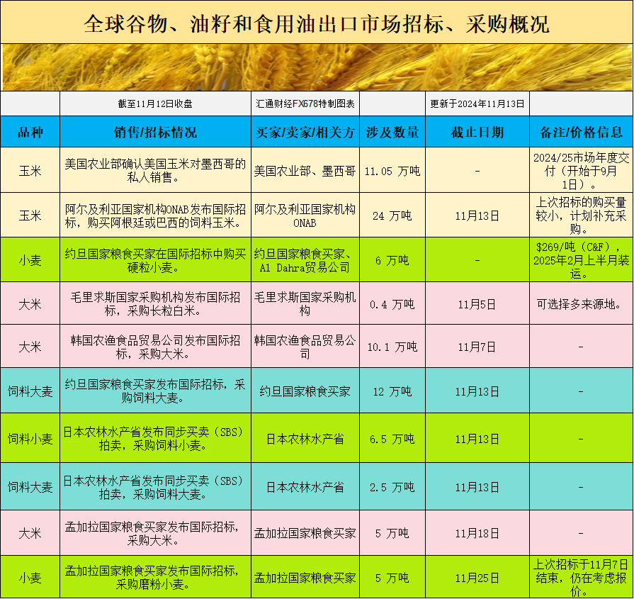 全球谷物、油籽和食用油出口市场招标、采购概况: