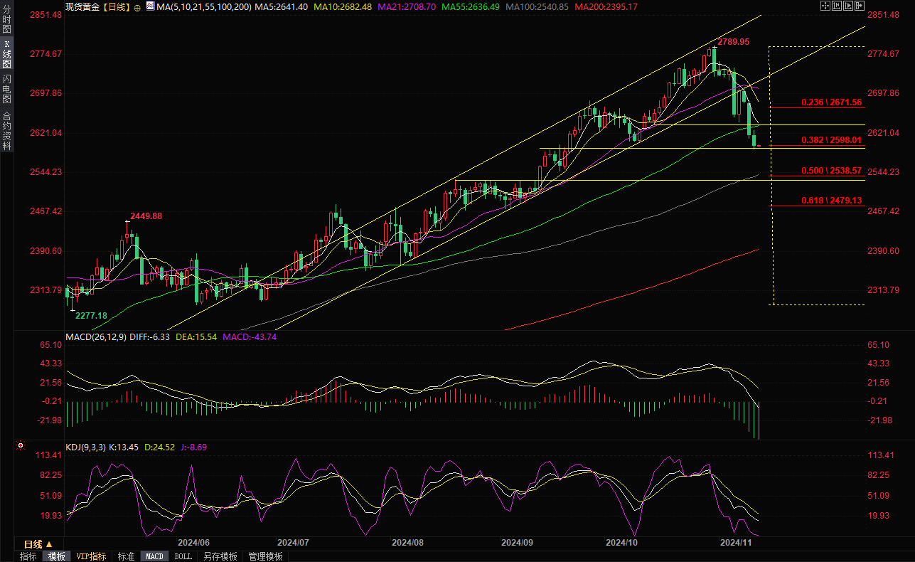 现货黄金窄幅震荡,目前交投于2598.56美元/盎司附近。金价周二跌至近两个月低点,盘中一度失守2600关口,至2589.61美元/盎司,收报2598.05美元/盎司,为连续三个交易日下跌,受累于美元走强至逾半年高位,对特朗普第二次执政后经济增长的乐观情绪以及11月5日美国总统大选后市场大范围转向。