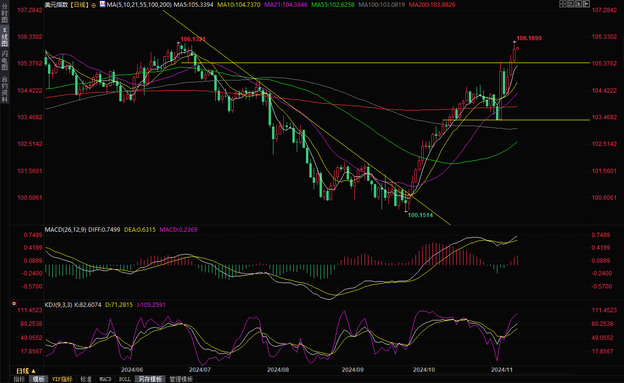 美元兑主要货币周二升至六个半月高点,特朗普赢得大选后,市场预计未来更高的关税预计将推高物价,使美联储的降息空间减少,美元因此大幅上涨。