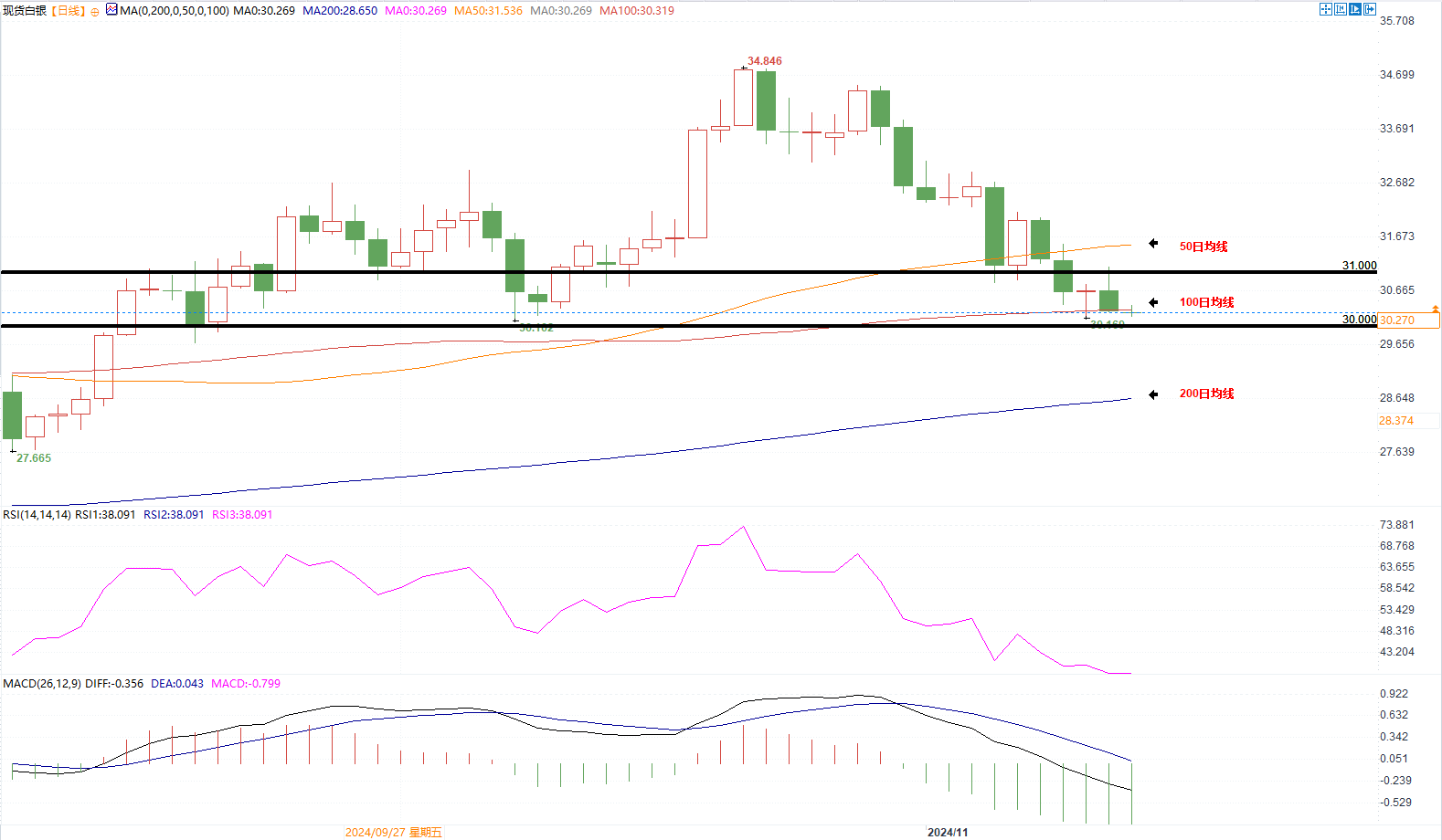标题:白银逼近30美元支撑,若跌破将测试200日均线