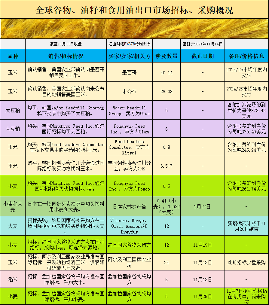 全球谷物、油籽和食用油出口市场招标、采购概况: