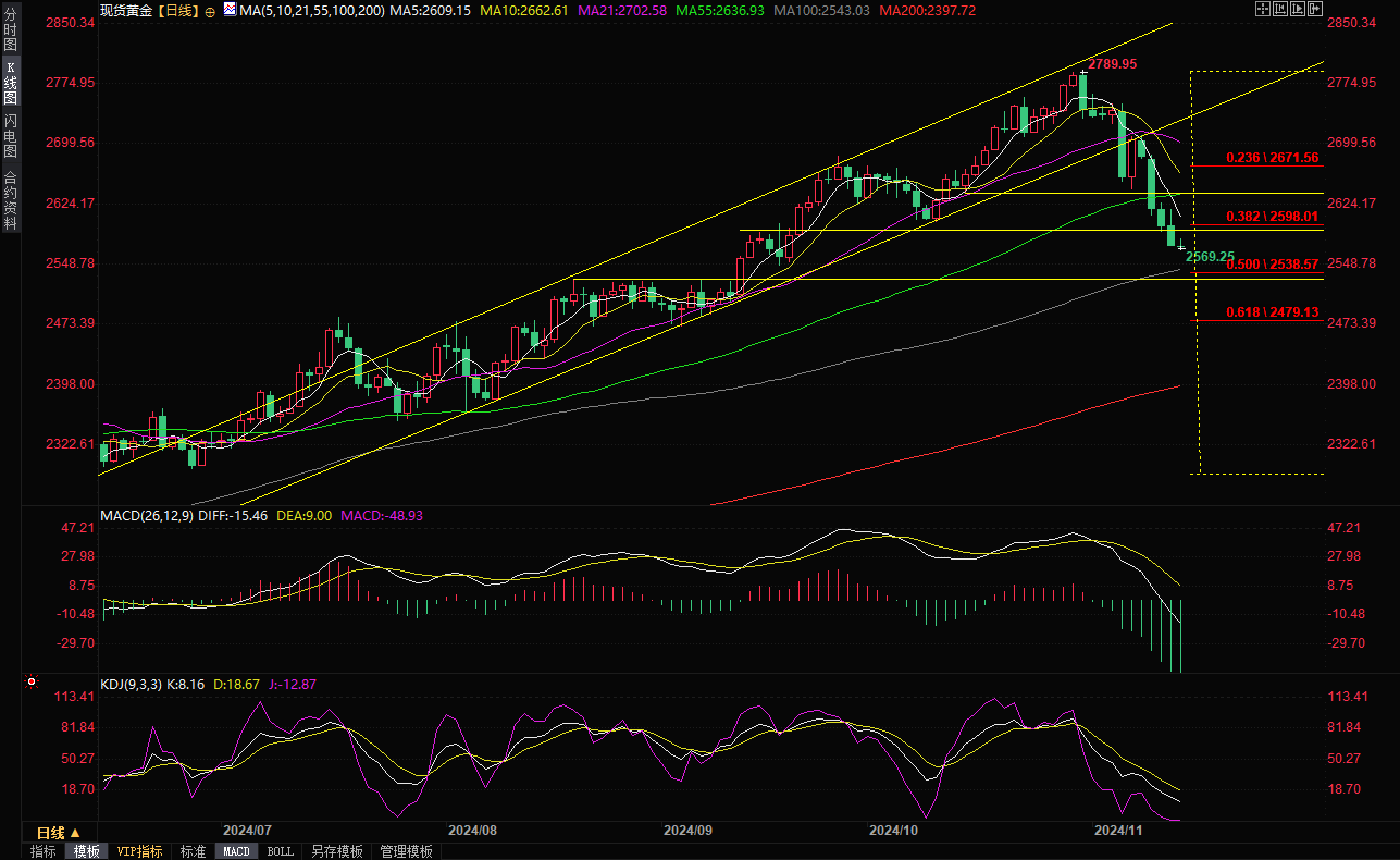 现货黄金在2572附近窄幅震荡。金价周三连续第四个交易日下跌,最低触及2569.25美元/盎司,为9月19日以来新低,受美元走强和美债收益率上升拖累,美国劳工部还报告称,美国10月份消费者物价涨幅符合预期。但自今年年中以来,降通胀的进展放缓,这可能导致美联储明年的降息次数减少。