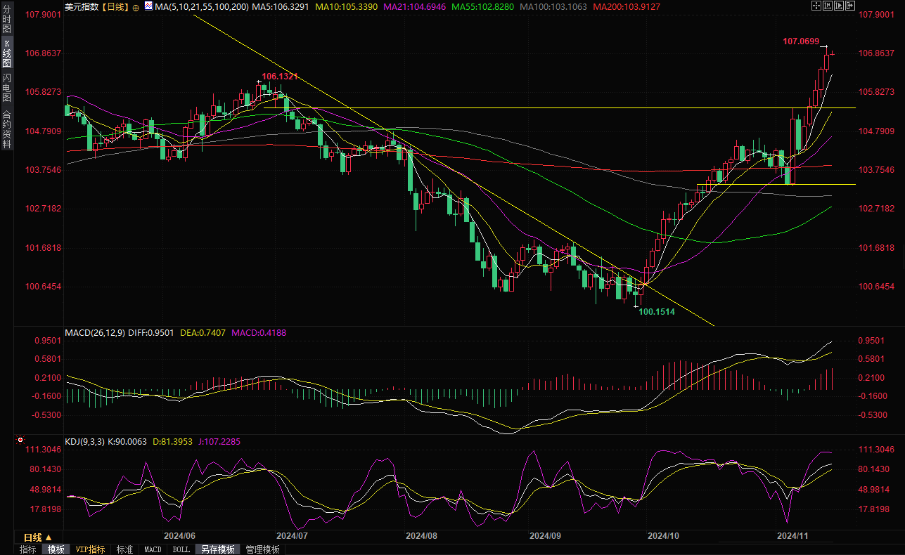 美元指数窄幅震荡,守在逾一年高位附近,现报106.9。美元兑主要货币周四走强,盘中创下一年新高至107.07,并连续第五个交易日上涨,继续受特朗普赢得大选将重返白宫以来市场的预期推动,美联储主席鲍威尔称“不急于降息”,打压美联储12月降息预期,也给美元提供支撑。