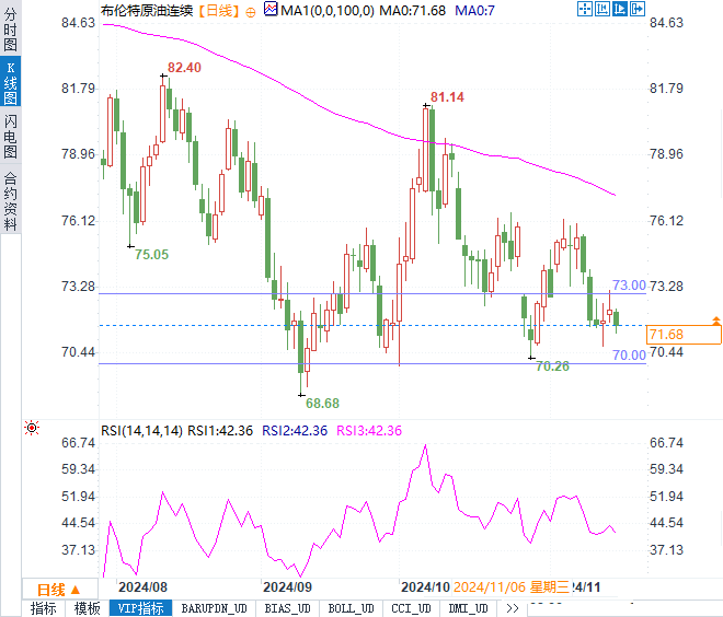 布伦特原油和WTI目前卖压较强。布伦特期货如跌破71美元/桶,下一步或将测试70美元/桶的支撑位,这将成为短期内多头守护的关键点位。若反弹至73美元/桶以上,则可能为市场多头带来一些喘息空间,但这一价格区间内的上行阻力依旧明显。