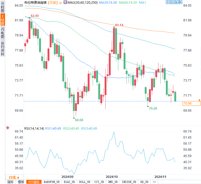 布伦特原油在每桶70美元附近徘徊,这一关口短期内有较强支撑。然而,若后续下破,可能进一步滑向68美元。