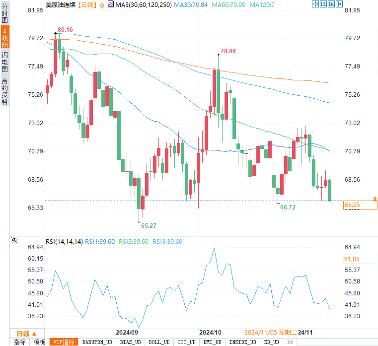 WTI原油同样面临下行压力,67美元的收盘价显示出空头力量较为强劲,若继续走弱,下一目标位可能是65美元。