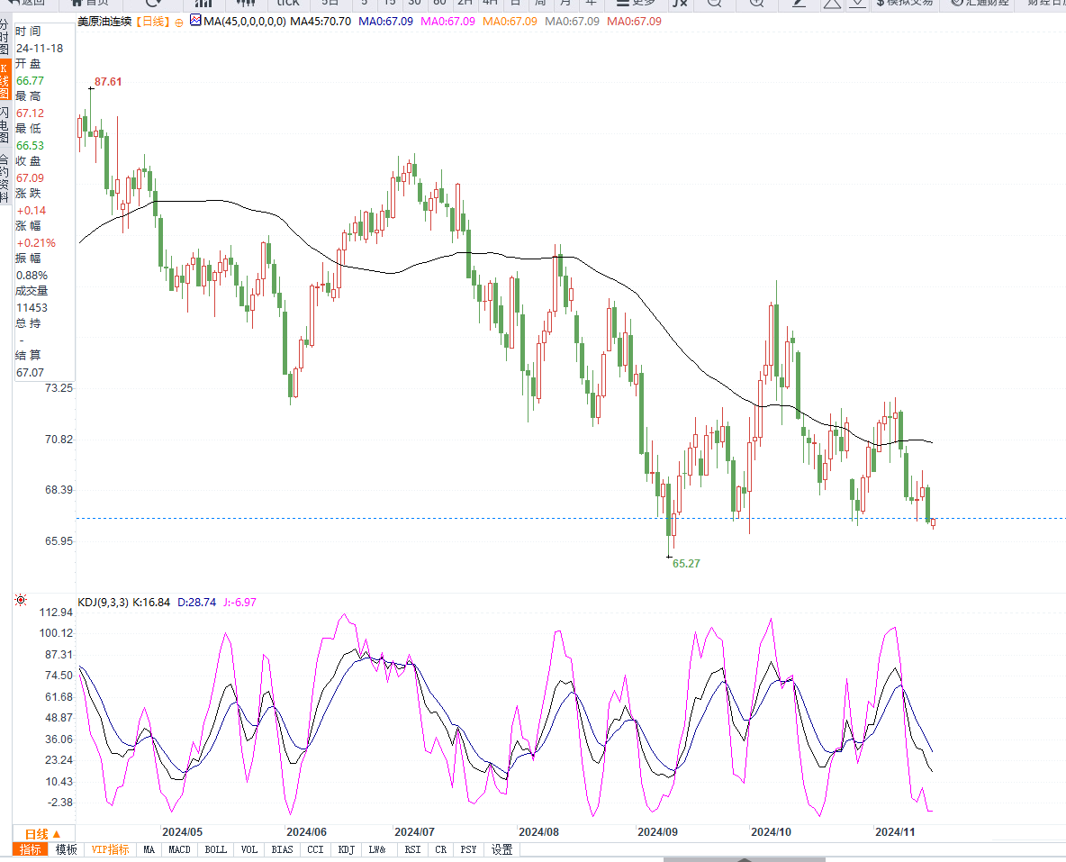 美原油亚盘时段小幅反弹,交投于67.05美元/桶附近,而周五则是大幅下行,破位箱体支撑,