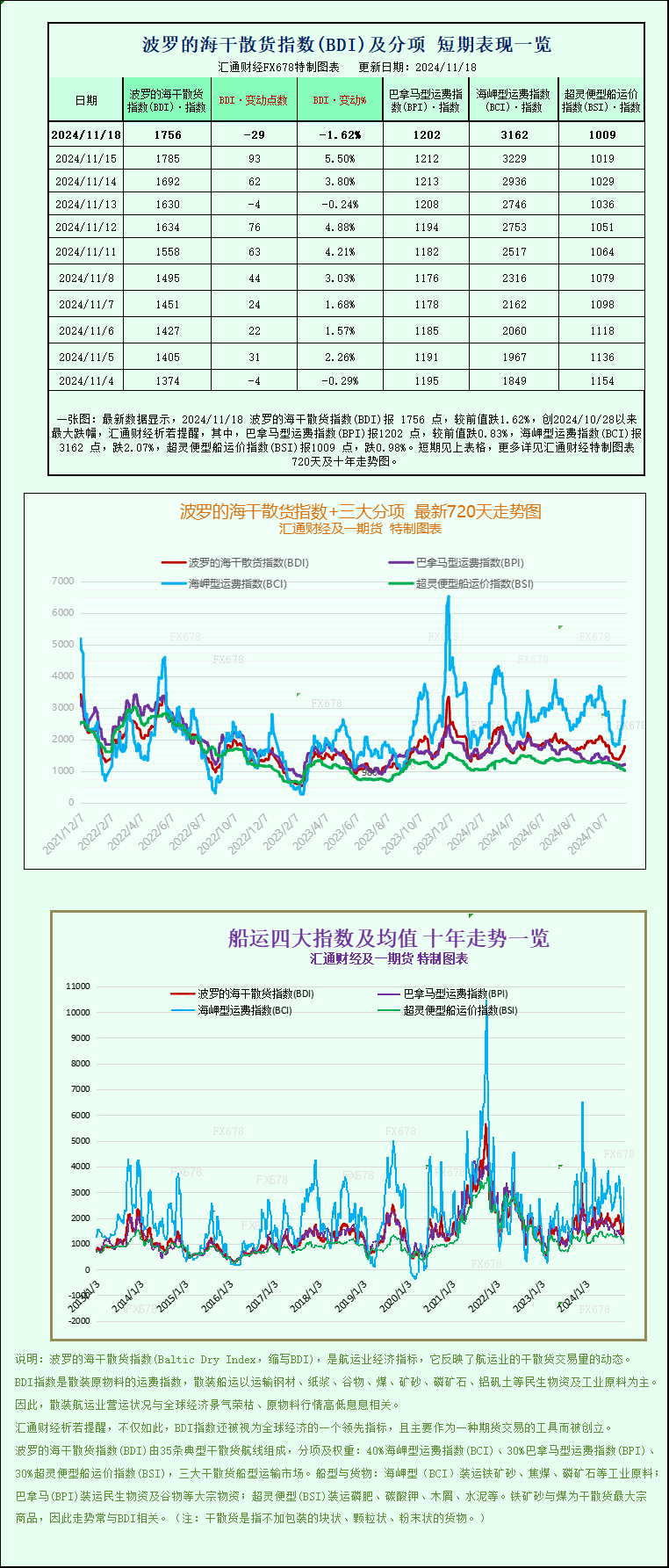 汇通财经APP讯——最新数据显示,2024/11/18波罗的海干散货指数(BDI)报1756点,较前值跌1.62%,创2024/10/28以来最大跌幅,其中,巴拿马型运费指数(BPI)报1202点,较前值跌0.83%,海岬型运费指数(BCI)报3162点,跌2.07%,超灵便型船运价指数(BSI)报1009点,跌0.98%。波罗的海干散货指数+三大分项的最新720天走势图、十年走势图等详见汇通财经特制图表。