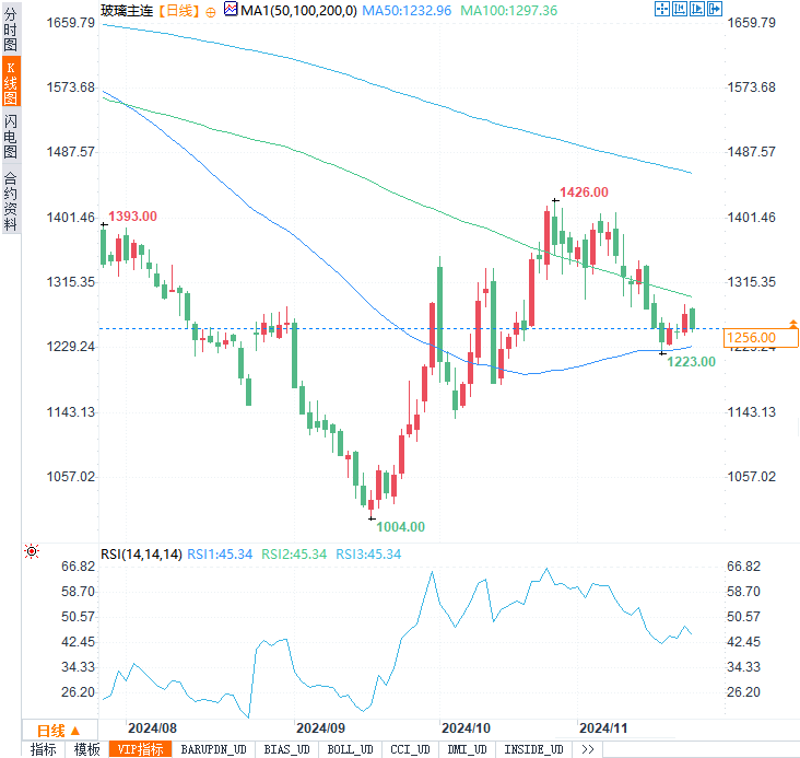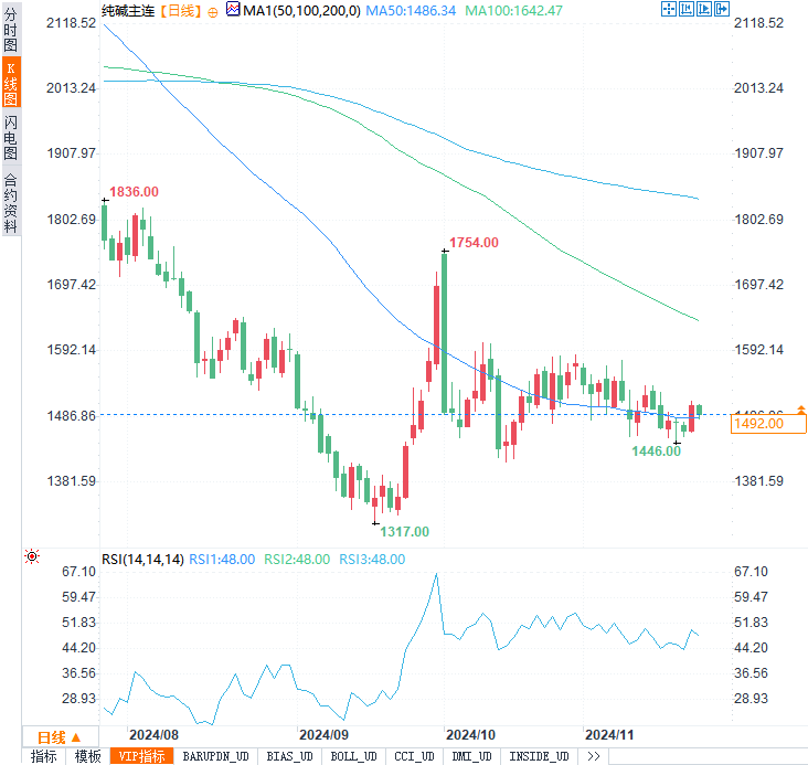 浮法玻璃市场整体弱势,11月21日均价为1391元/吨,环比下跌0.71%。从供需情况看,浮法玻璃日熔量维持在15.85万吨,而光伏玻璃产能环比减少1.32%。尽管库存下降一定程度缓解短期压力,但整体价格受需求疲软拖累。预计纯碱和玻璃短期内继续震荡运行。
