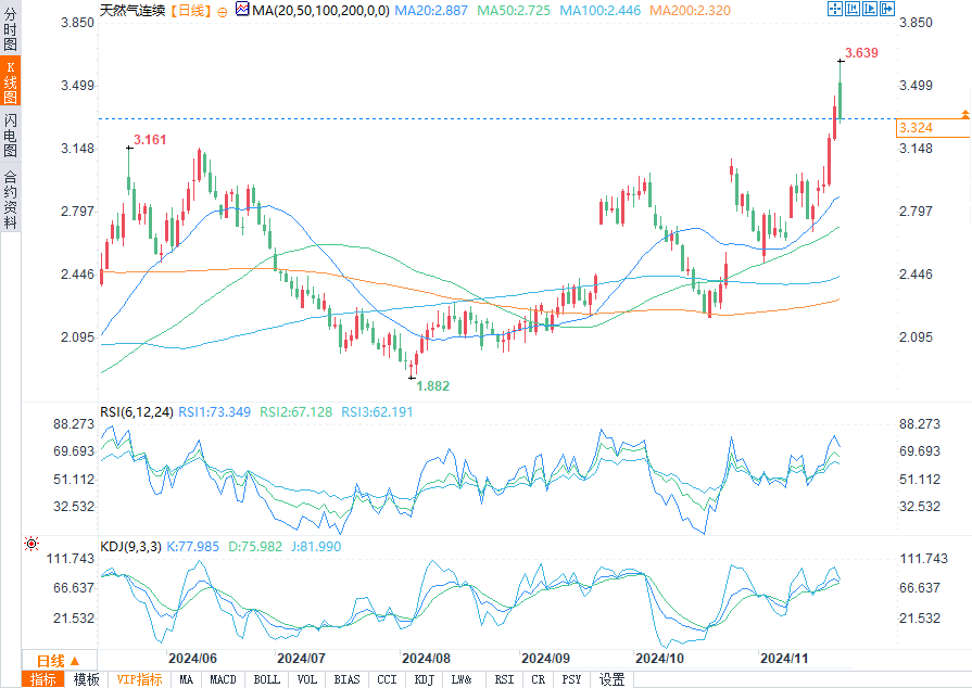 在上行路上,阻力位包括200日移动均线3.332美元和10月高点3.573美元。价格走势表明,市场即将形成收盘价反转顶部,这通常是短期回调的前兆。这一转变反映了交易员的情绪,即在供应强劲的情况下,价格可能已经消化了即将到来的寒冷天气。