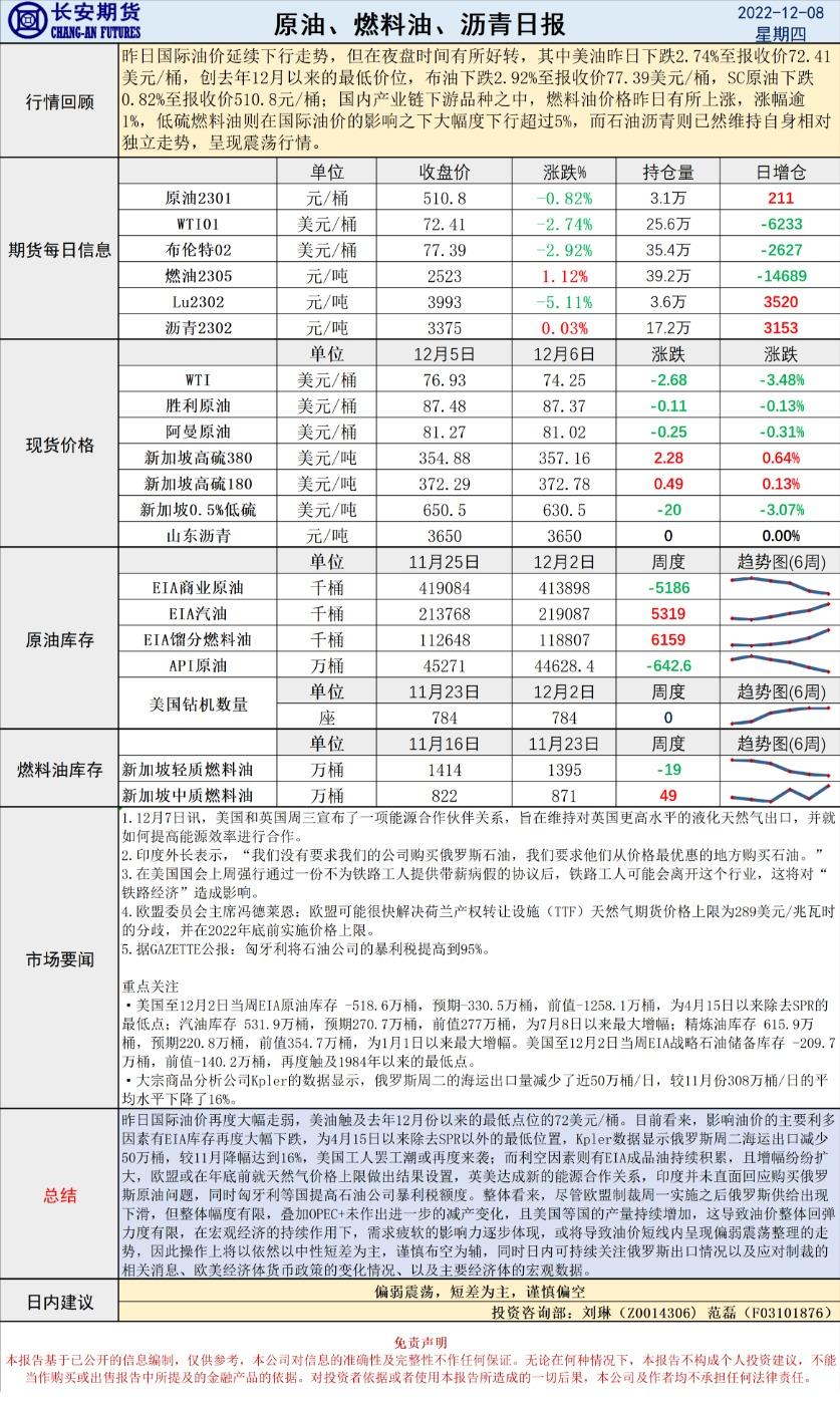 12月8日,长安期货发布原油早评,认为原油将偏弱震荡,短差为主,谨慎偏空。