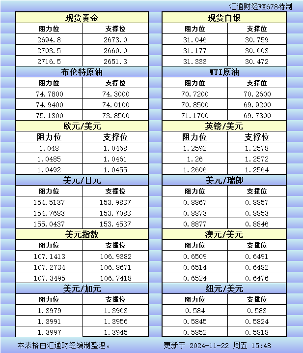 11月22日欧市更新的支撑阻力:金银原油+美元指数等八大货币对