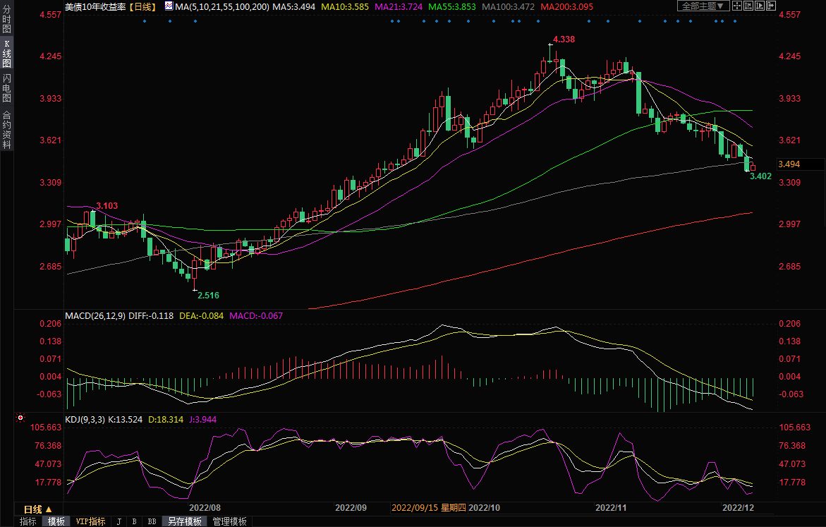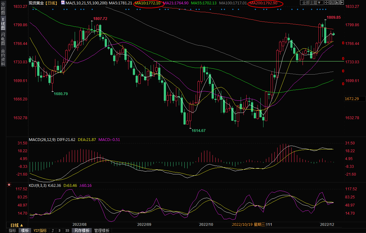 由于市场预计美联储将放缓加息步伐,美国10年期国债收益率持续走弱,周三失守100日均线一度创近三个月低点至3.402%,帮助金价从10日均线附近反弹,盘中最高触及1790.43美元/盎司,收报1785.88美元/盎司。道明证券(TD Securities)大宗商品市场策略主管Bart Melek表示,“我们看到国债收益率全线下跌......美元小幅走软......金价只是从低位反弹。”