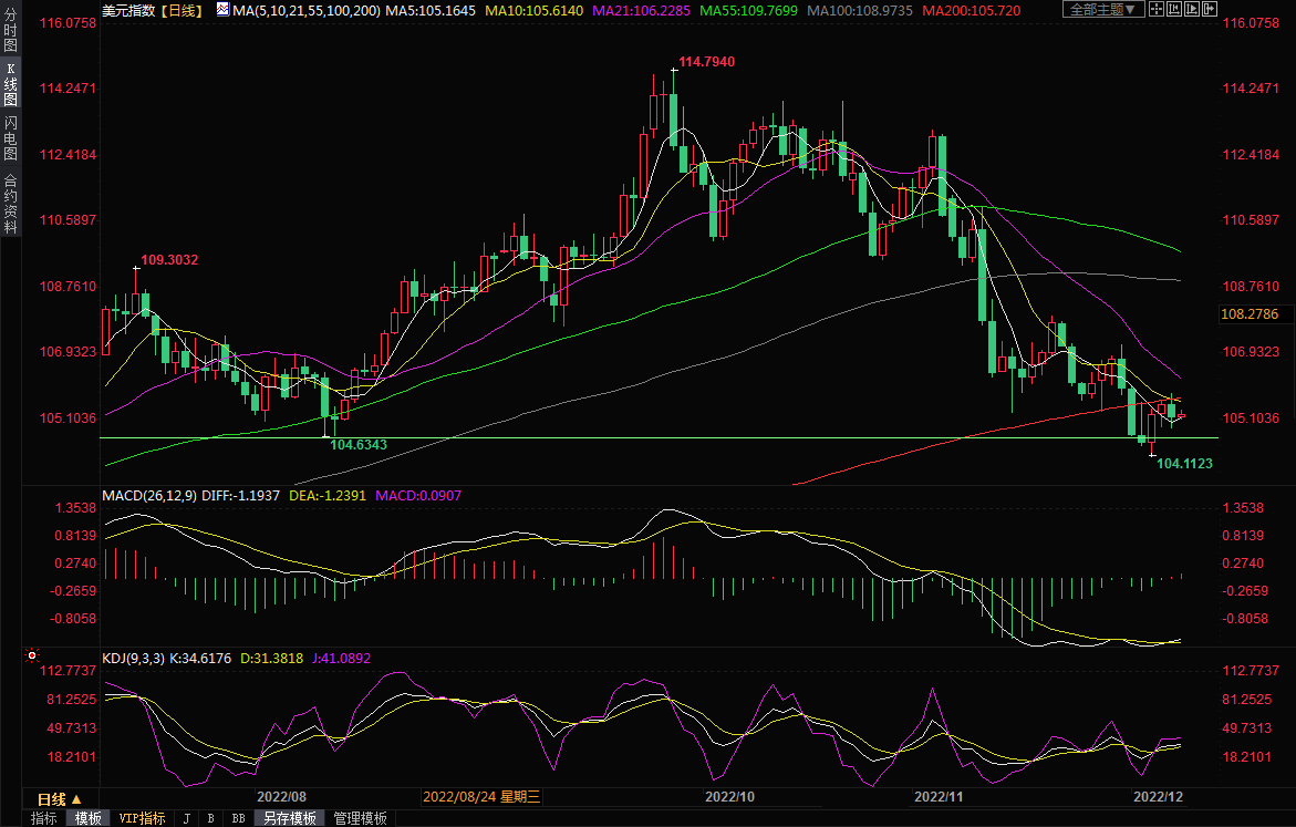 美元指数周三受到10日均线和200日均线的双重阻力压制,收盘下跌0.35%,收报105.20附近。一些投资者一直预期美联储将很快放缓加息步伐,这仍在中长线压制美元走势。