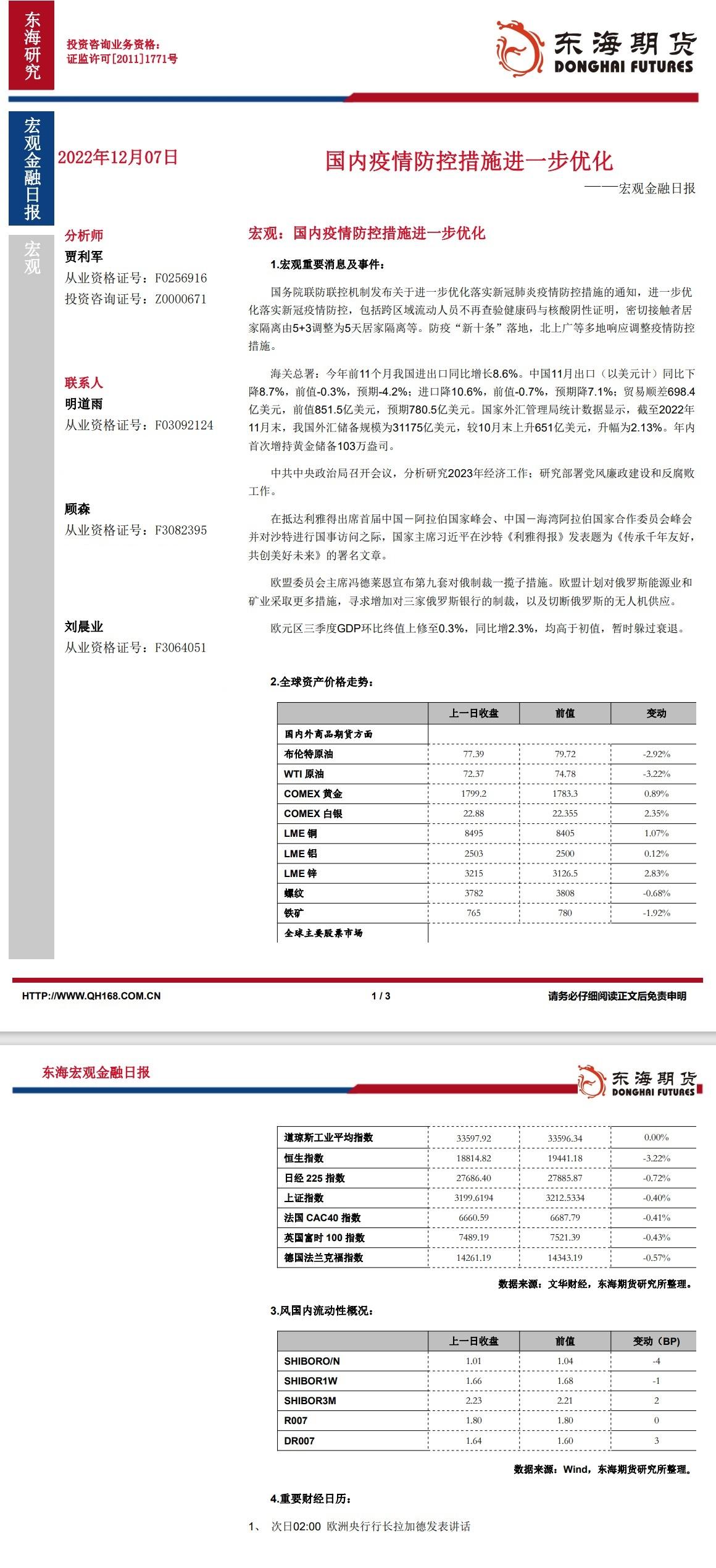 标题:【东海期货12月8日宏观金融日报】:国内疫情防控措施进一步优化