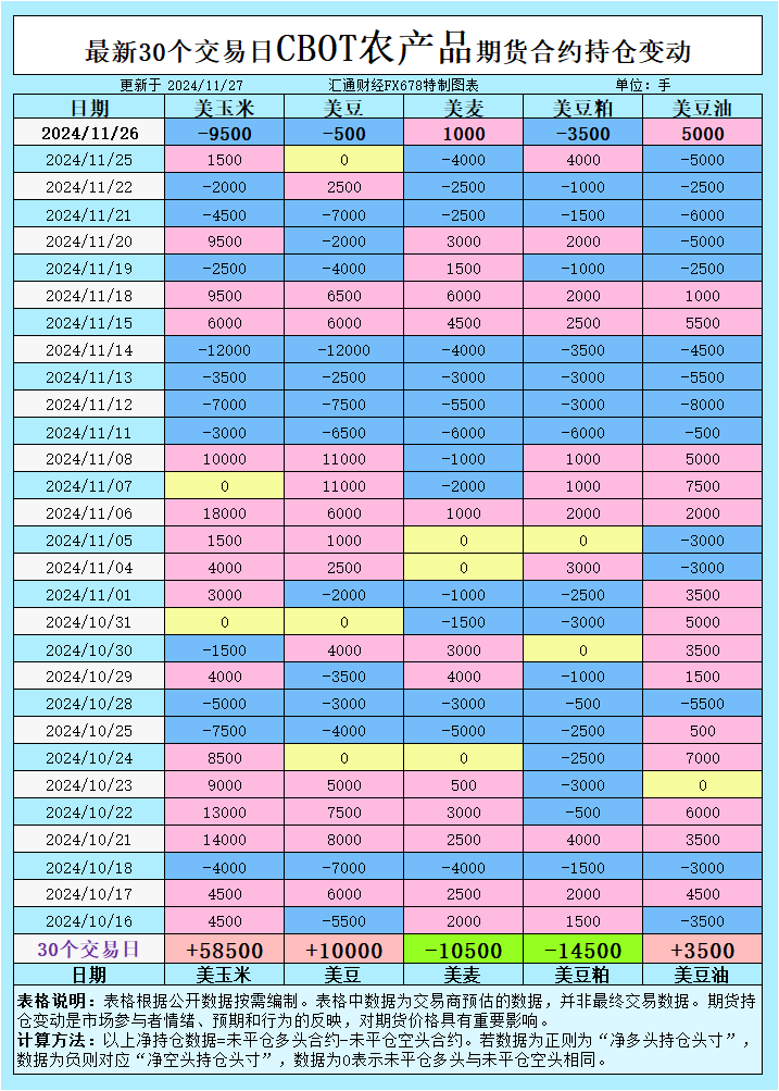 增加CBOT玉米投机性净多头;增加CBOT大豆投机性净多头;增加CBOT小麦投机性净空头;增加CBOT豆粕投机性净空头;增加CBOT豆油投机性净多头。