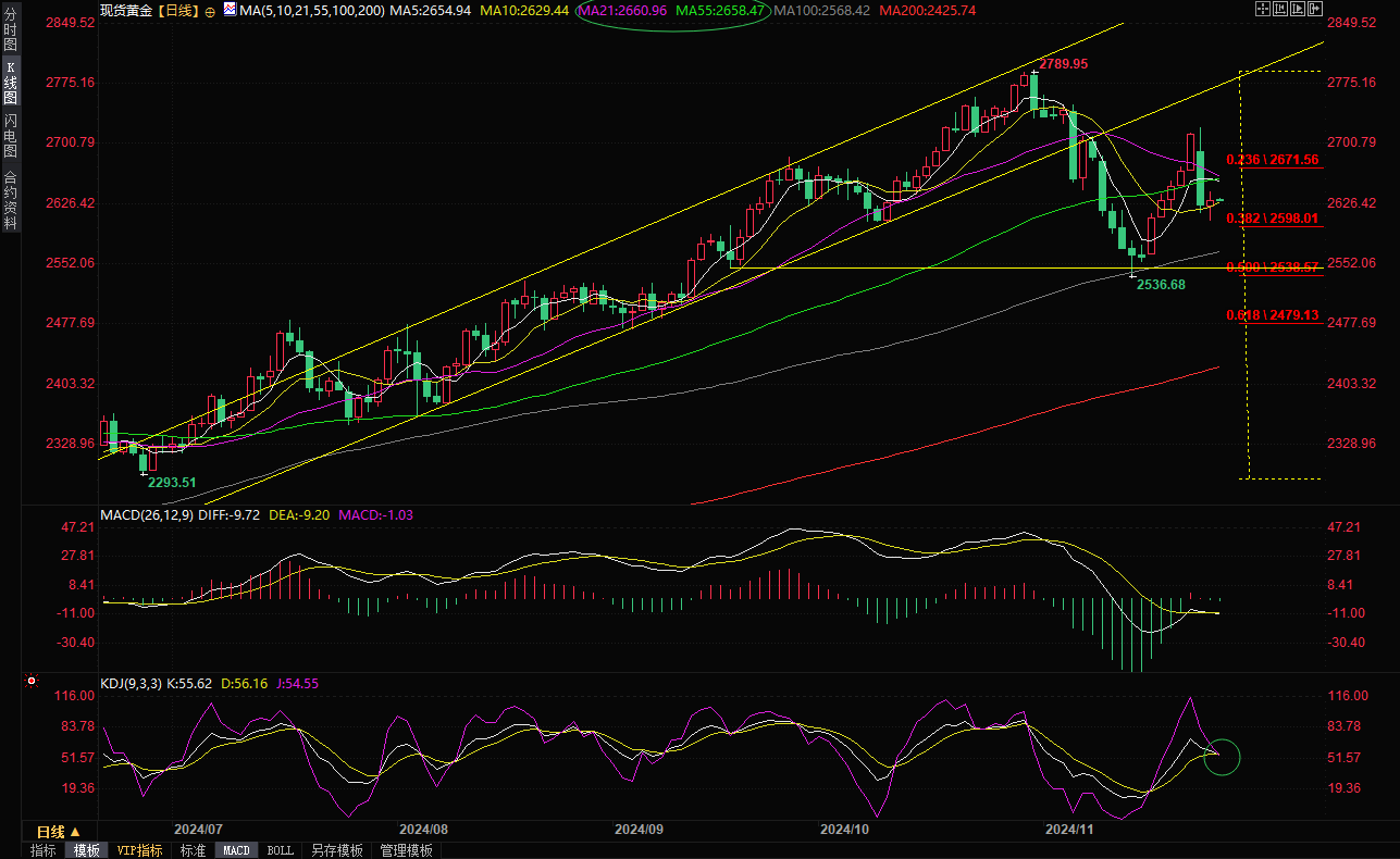 现货黄金窄幅震荡,目前交投于2632.67美元/盎司附近。金价周二持稳,稍早在拉锯战中一度触及一周最低至2605.13美元/盎司,此前以色列与黎巴嫩达成停火协议,避险需求趋软,但对乌克兰问题和美国当选总统特朗普关税计划的担忧限制了金价跌幅,金价周二收报2633美元/盎司,涨幅约0.29%。