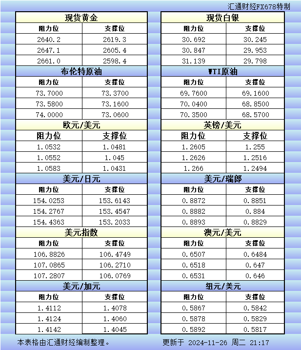 标题:11月26日美市更新的支撑阻力:金银原油+美元指数等八大货币对
