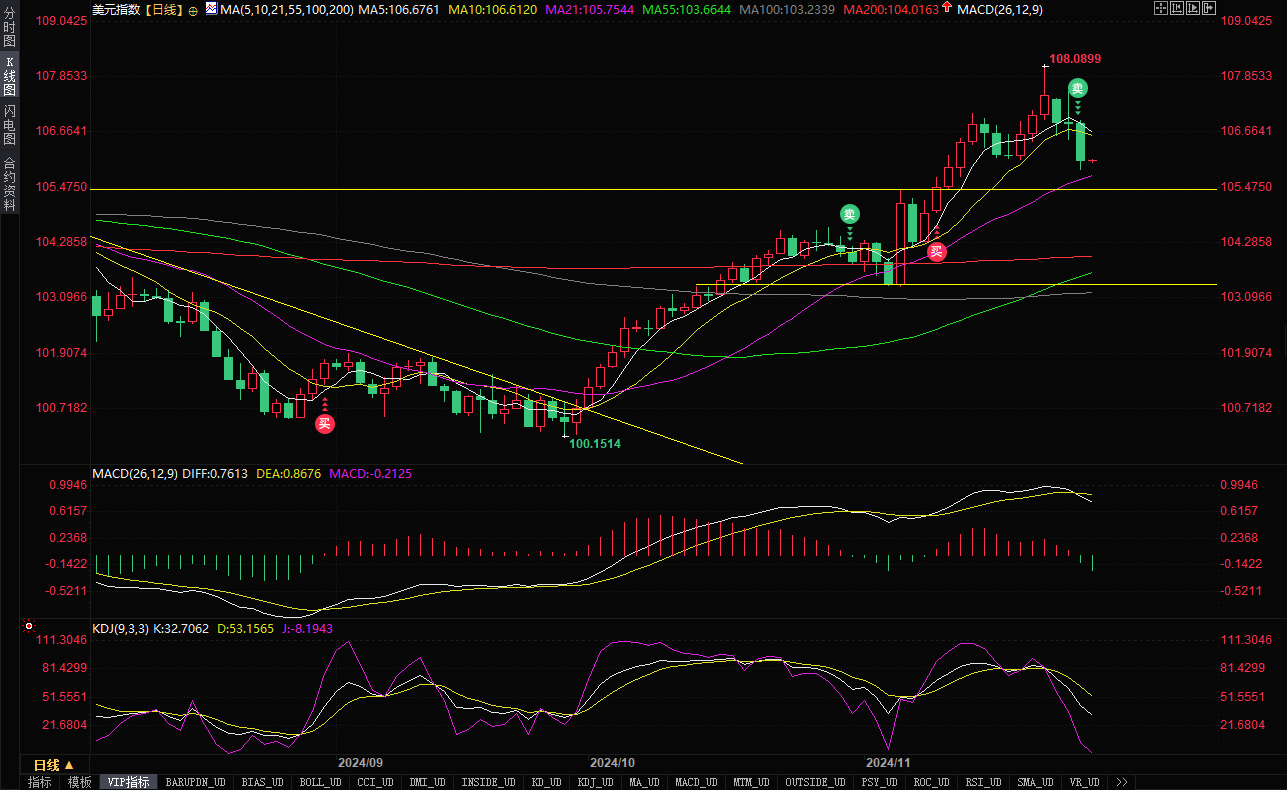 美元指数周三下跌0.77%,为近三周最大单日跌幅,收报106.06,盘中最低曾触及105.85,为近两周新低。