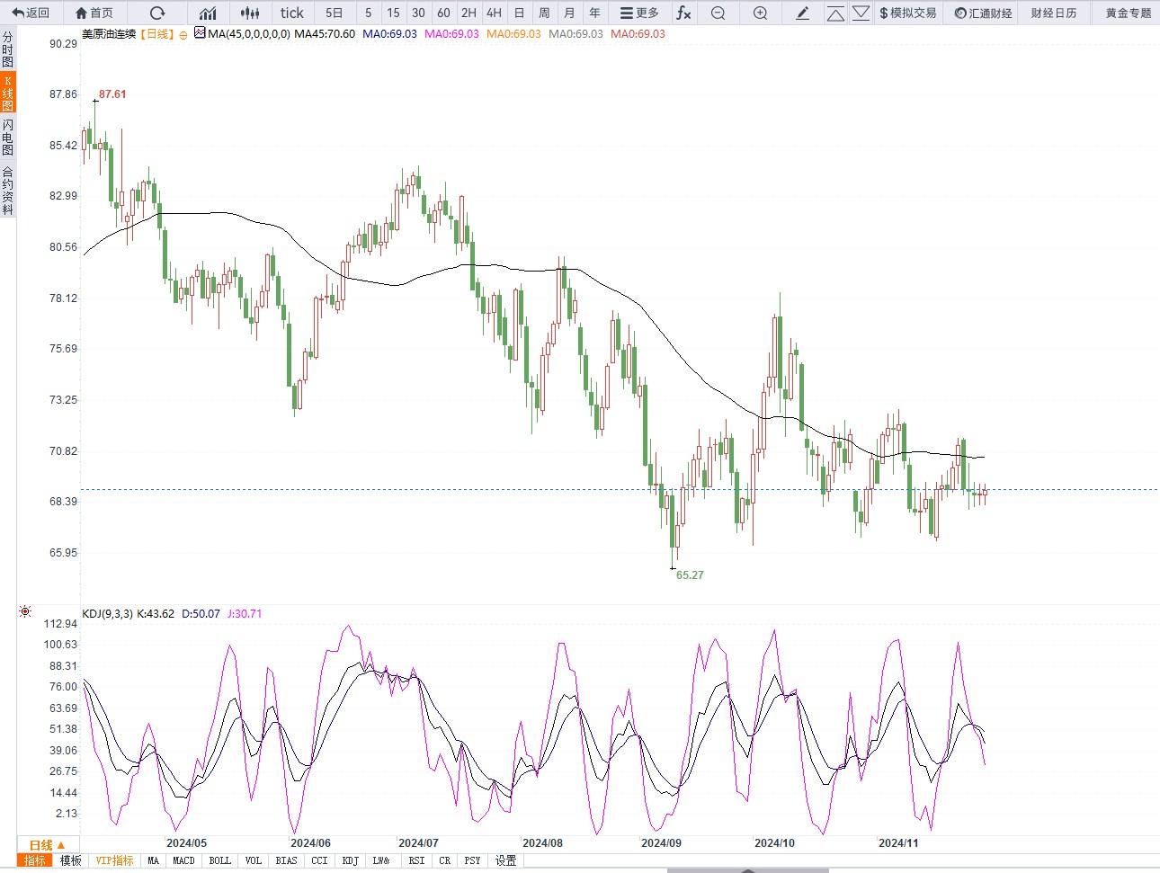 美原油亚盘时段小幅上涨,交投于69.00美元/桶附近,由于昨日感恩节提前休市,市场波动率降低,基本面上以色列和真主党相互指责违反停火协议,地缘局势左右摇摆,油价维持区间震荡。