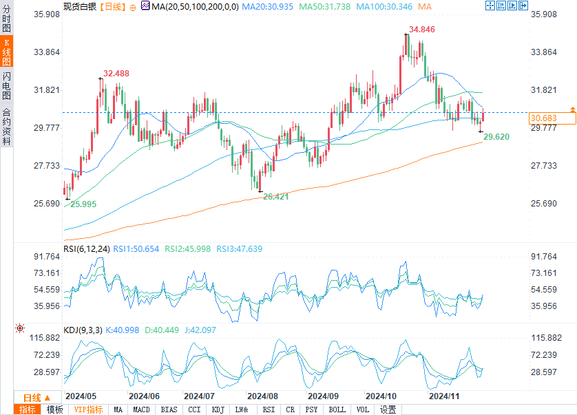 政治风险增加了市场复杂性美元跌至11月12日以来最低水平,支撑了银价。然而,当选总统特朗普提出的针对墨西哥和加拿大的关税上调可能会加剧国内通胀,可能迫使美联储维持比预期更长时间的高利率。根据芝加哥商品交易所集团(CME Group)的美联储观察工具(FedWatch Tool),市场参与者目前预计12月降息的可能性为66.3%。