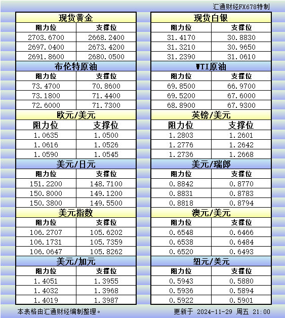 标题:11月29日美市更新的支撑阻力:金银原油+美元指数等八大货币对