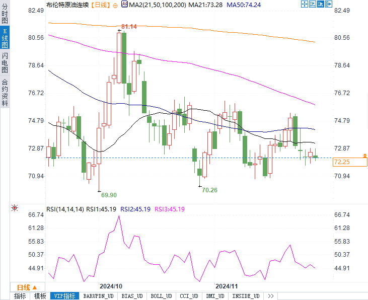 美原油分别交投于72.22美元/桶和68.44美元/桶,日内分别下跌0.63%和0.42%。尽管中东局势略有缓和,但供需前景的重新评估和OPEC+会议推迟至12月5日的消息共同施压油价。