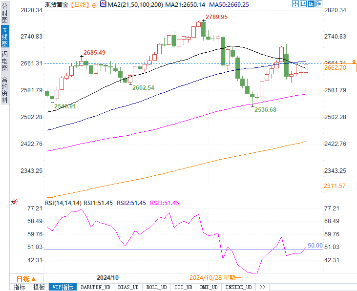 现货黄金日内上涨0.91%,报2661.54美元/盎司,但11月整体下跌近3%,录得自2023年9月以来的最差月度表现。银、铂和钯价也出现类似下行趋势。这一走势主要归因于美元本月因特朗普胜选及其政策预期走强,导致贵金属承压。