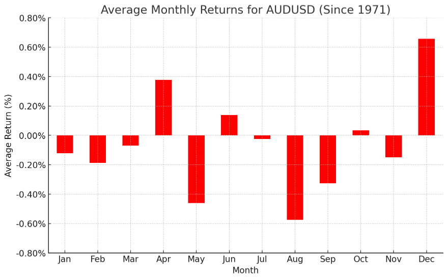澳元兑美元在12月出现了历史上强劲的看涨回报,当月平均涨幅为0.66%。上个月,