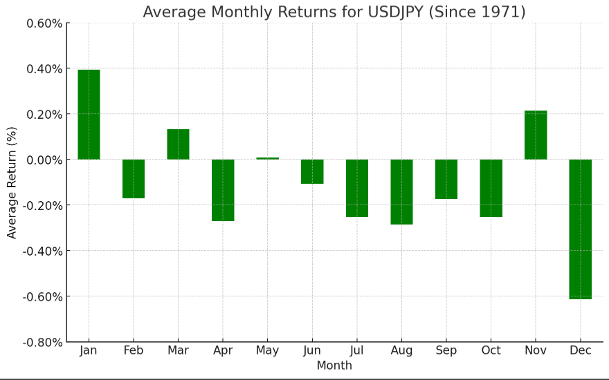 从历史上看,12月对美元/日元来说是一个看跌的月份,自布雷顿森林协议以来,该货币对平均下跌了-0.61%,这是过去半个多世纪以来平均表现最差的一个月。该货币对在11月初一度走高,但在当月晚些时候回落,此后几乎保持不变,不过在进入熊市季节之前,该货币对仍有潜在的看跌势头。