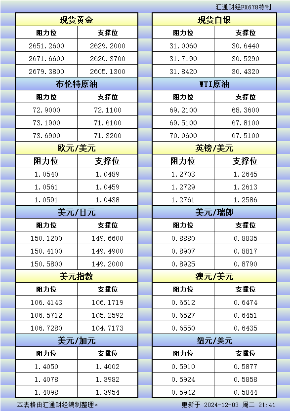 标题:12月3日美市更新的支撑阻力:金银原油+美元指数等八大货币对