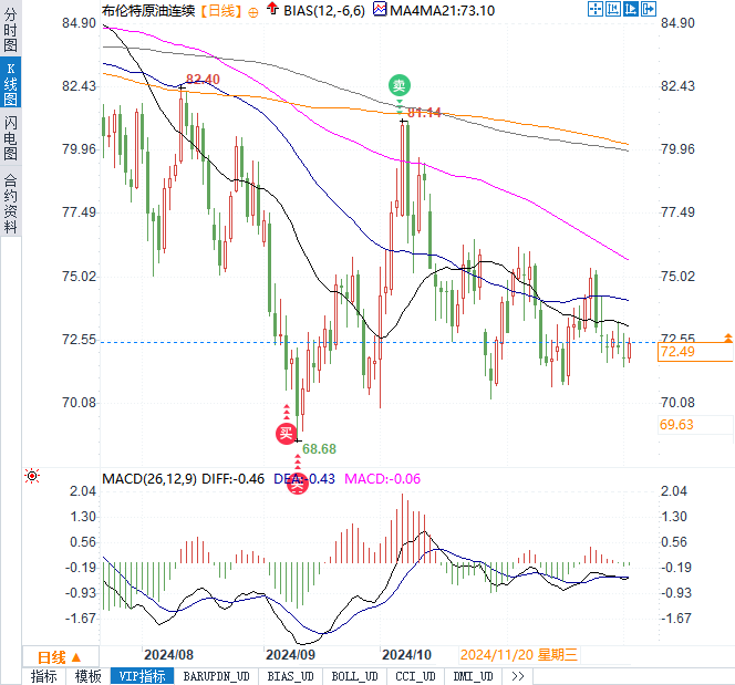 布伦特原油期货周二上涨0.9%,交投于72.53美元/桶,