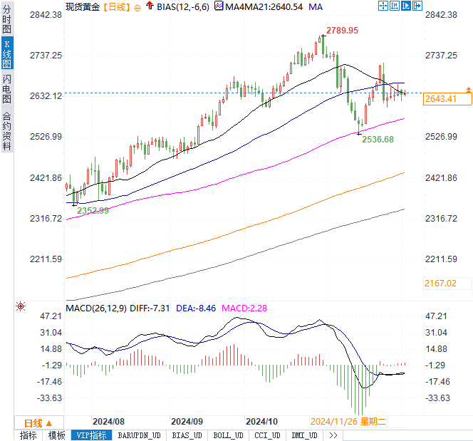 现货黄金周二上扬0.3%,至2644美元/盎司,延续了此前的涨势。美国10年期国债收益率接近一个月低点,为黄金提供了支撑。同时,