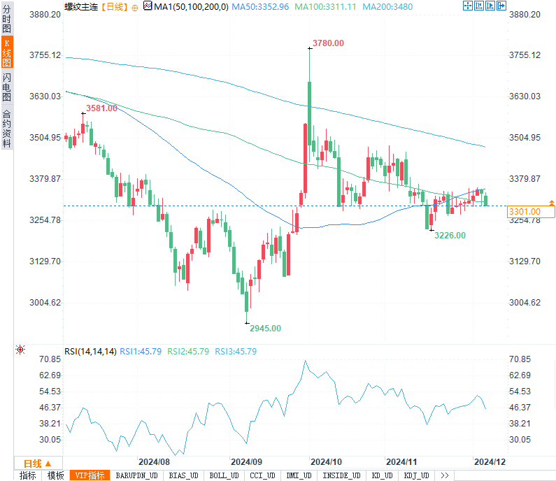 螺纹钢主力合约今日走势震荡。随着冬季的深入,建筑行业需求逐步回落,而钢厂开始季节性减产,使供需格局维持相对平衡。短期来看,制造业需求的支撑以及铁矿石价格的强势对螺纹钢构成一定利好。
